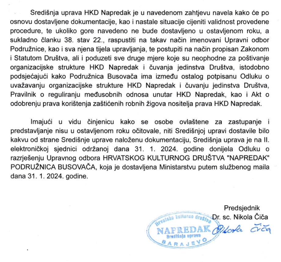 U praksi to znači da Statut kojim se pokušalo promijeniti ime, preoteti imovinu i raskinuti svoj odnos s Središnjom upravom, ne vrijedi i da pravna osoba i dalje nosi ime HKD ”Napredak” Podružnica Busovača i da je Odluka o razrješenju važeća, te da će sada svaki sljedeći korak bilo koga u procesu zaista biti tretiran kao svjesno oduzimanja imovina koja je napravljena na zemljištu koje je općina Busovača svojom Odlukom iz 1991. godine dodijelila HKD ”Napredak”, a podružnica je svoju pravnu samostalnost stekla tek desetak godina poslije.