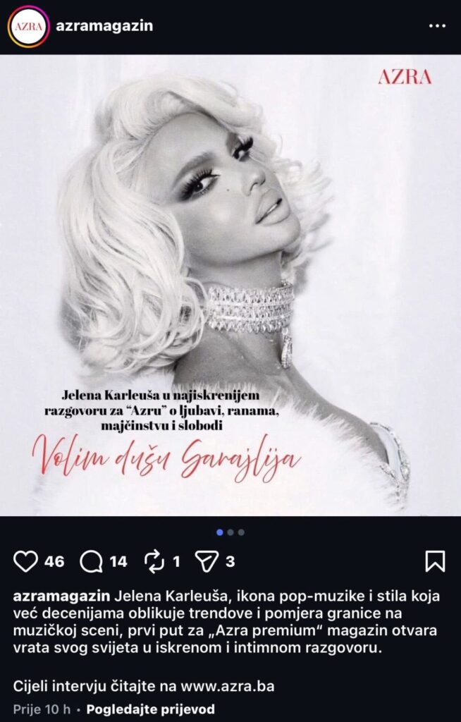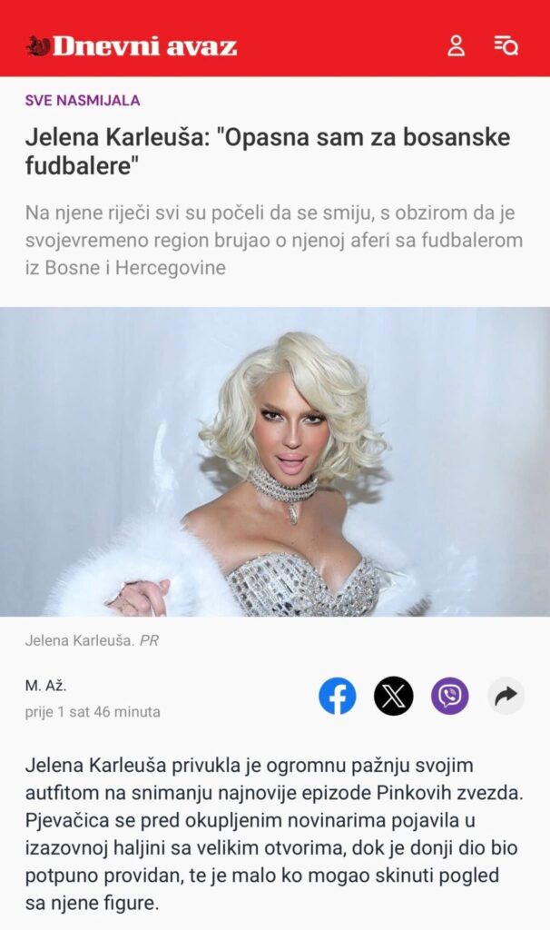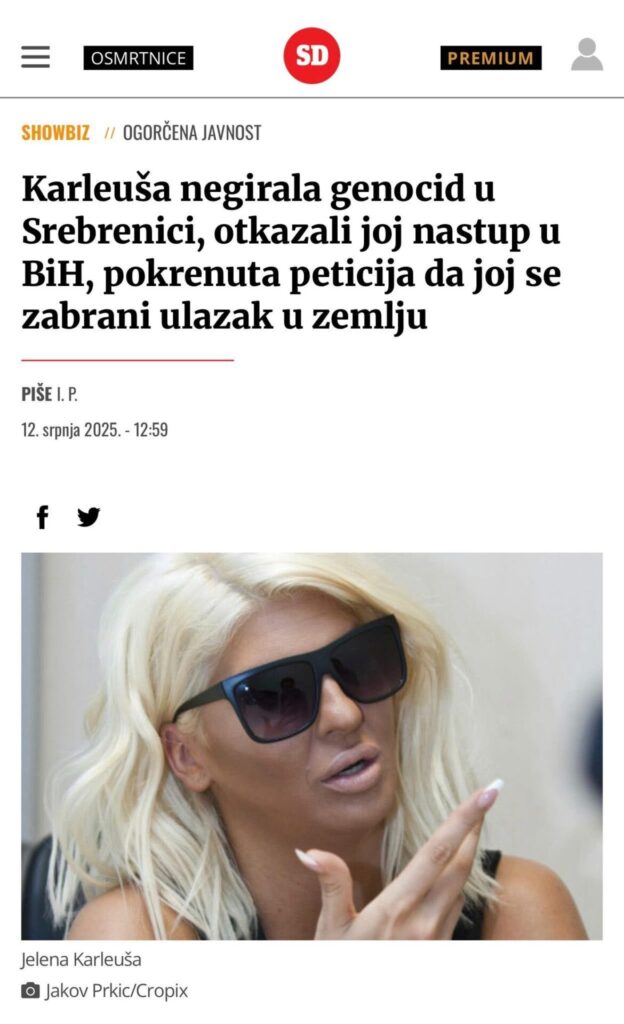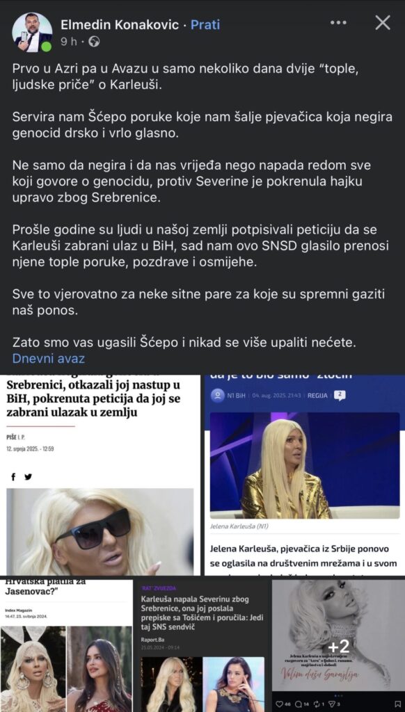 Ministar vanjskih poslova Bosne i Hercegovine Elmedin Konaković objavio je na svom Facebook profilu status u kojem je izravno prozvao pjevačicu Jelenu Karleušu, optuživši je za drsko i glasno negiranje genocida. Povod njegovoj reakciji bili su nedavni tekstovi u sarajevskim medijima koje je Konaković opisao kao pokušaj serviranja “toplih ljudskih priča” o osobi koja, prema njegovim riječima, vrijeđa žrtve i napada sve one koji govore istinu o Srebrenici.