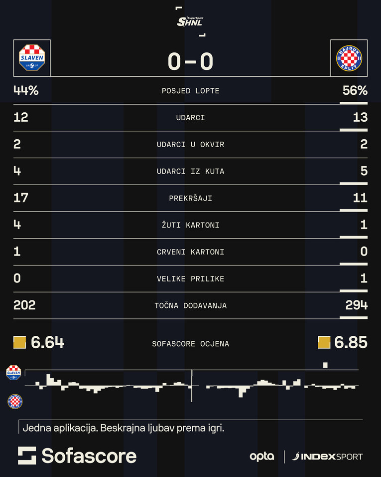 Drugo poluvrijeme počelo je mirno uz blagu inicijativu Hajduka. Najbolju priliku za vodstvo u nastavku imali su Splićani u 59. minuti. Tada je Rebić ostao sam u šesnaestercu Slavena, no njegov udarac iskosa obranio je Ivan Čović.