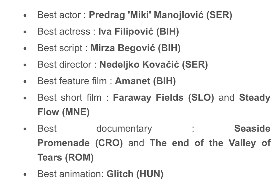 Osim Amaneta na Festivalu su učestvovali i srbijanski film “Vera“, makedonski film “Cinema love”, srbijanski film “Trail of the Beast“ u kojem igra Predrag Miki Manojlović, dobitnik nagrade za najboljeg glumca kao i drugi filmovi iz zemalja učesnica.