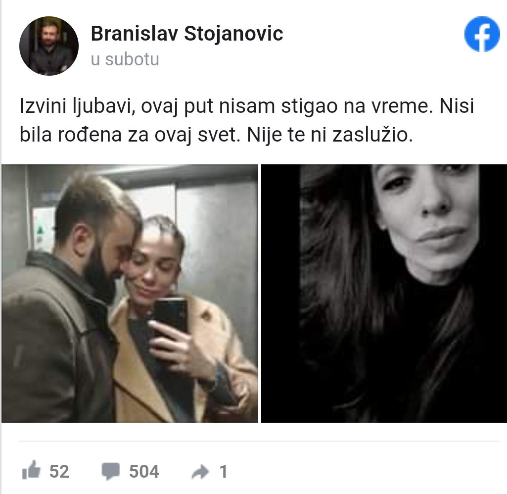Njen suprug Branislav se na društvenim mrežama oprostio potresnom porukom. “Izvini ljubavi, ovaj put nisam stigao na vrijeme. Nisi bila rođena za ovaj svijet. Nije te ni zaslužio”, napisao je na Facebooku. “Volio sam te kao nikoga prije i voljet ću te zauvijek”, dodao je.