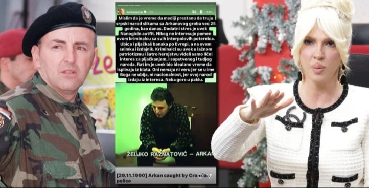 – Mislim da je vrijeme da mediji prestanu da truju srpski narod slikama sa Arkanovog groba već 25 godina. Dodatni stres je uvijek Nanogičin autfit. Nikog ne interesuje spomen ovom kriminalcu sa svih Interpolovih potjernica. Ubica i pljačkaš banaka po Evropi, a na ovom snimku i izdajnik. Kriminalci su uvijek u lažnom patriotizmu i šatro herojstvu vidjeli samo lični interes za pljačkanje sopstvenog i tuđeg naroda. Rat im je uvijek bio idealno vrijeme da isplivaju iz blata. Oni nemaju ni vjeru jer se u ime Boga ne ubija, ni nacionalnost, jer svoj narod izdaju iz interesa. Neka gore u paklu – napisala je Jelena Karleuša.