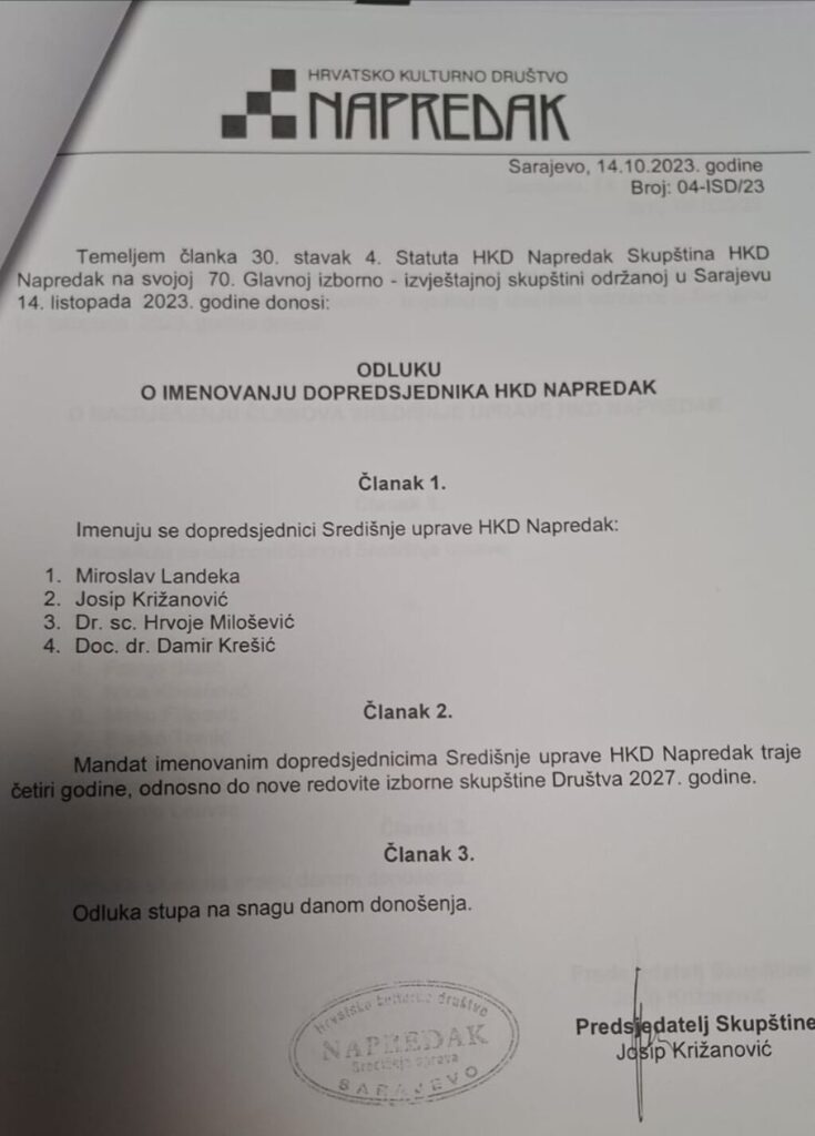 U Zenici je u subotuodržana izvještajna Skupština Hrvatskog kulturnog društva Napredak, obilježena napetostima, proceduralnim nepravilnostima i otvorenim kršenjem Statuta, što je izazvalo oštre reakcije brojnih članova i podružnica širom BiH i RH. Prema informacijama dostupnim od zastupnika na Skupštini, predsjednik Društva Nikola Čiča angažirao je zaštitare kako bi spriječio ulazak i sudjelovanje prije svega dva dopredsjednika piše Istina