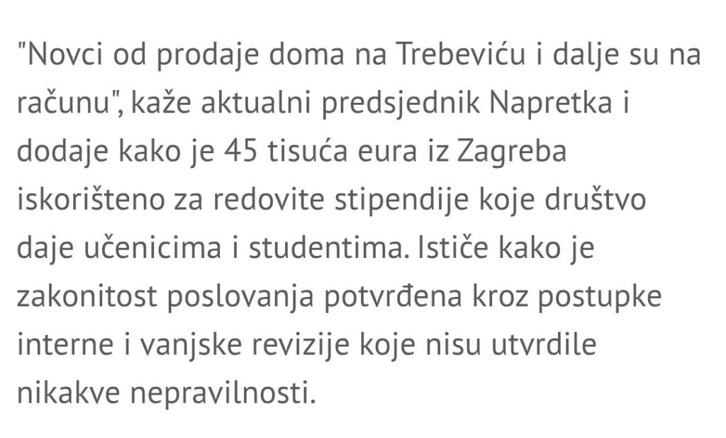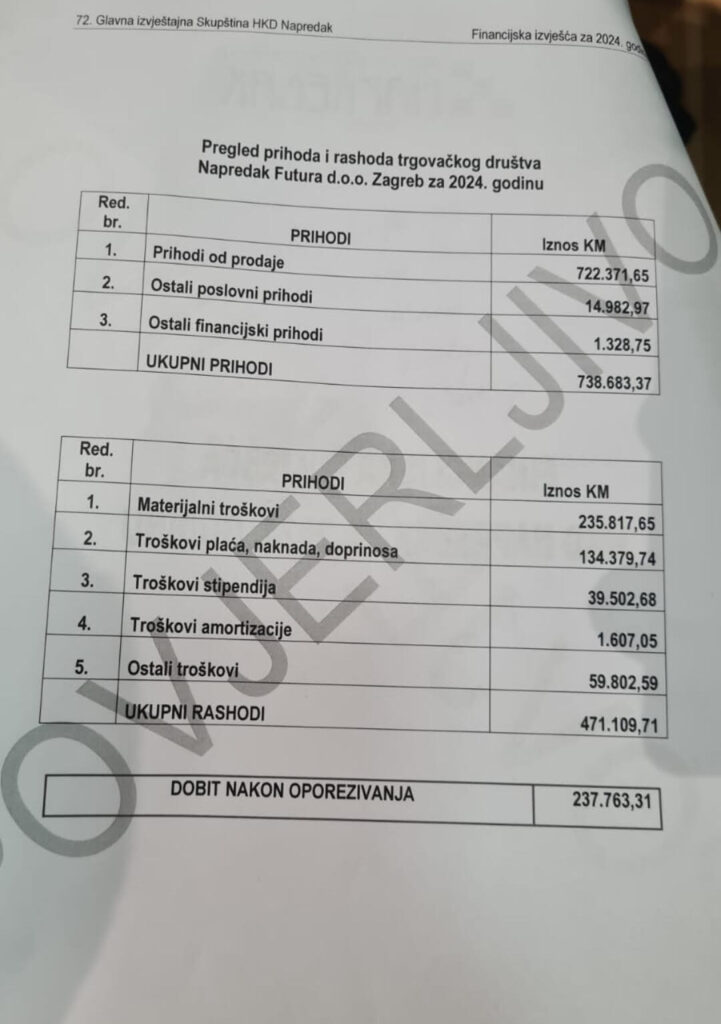 Nevjerojatnim je i činjenica da Skupštini nije uopće dostavljen službeni financisjki izvještaj u vidu ovjerene službene financisjke dokumentacije, nego su se pojavila dva dokumenta koja čak ne prikazuju ni identične financijske pokazatelje. Još više je odjeknula i činjenica da je samo dva dana poslije predsjednik Nikola Čiča u izjavi za Hinu naveo da je poduzeće Napredak Futura d.o.o. dodijelilo 45.000 eura za stipendije studentima i učenicima.