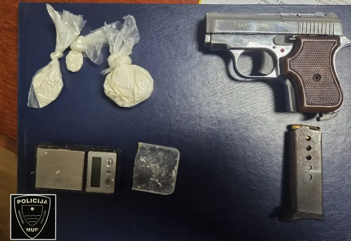 Tom prilikom navedeno lice dobrovoljno je predalo tri pvc kesice s neutvrđenom količinom NN bijele tvari koja asocira na opojnu drogu amfetamin, jednu digitalnu vagu za precizno mjerenje s vidljivim tragovima bijele materije te pištolj marke “Zastava” s pripadajućim okvirom i municijom.