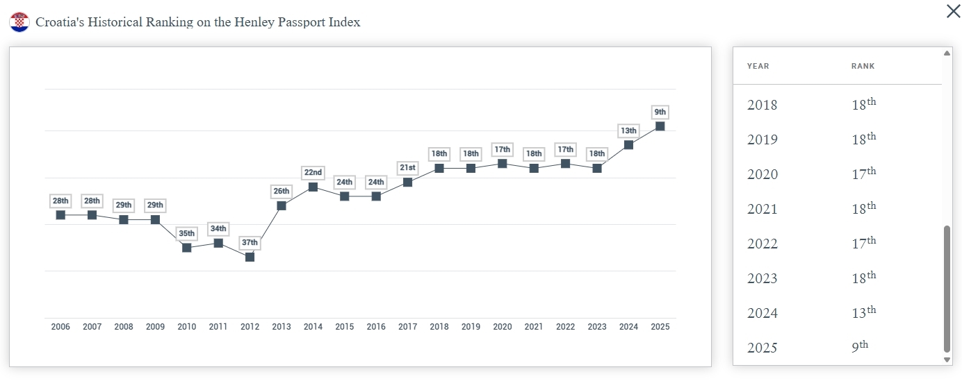 Hrvatska putovnica stoji nikad bolje. Prvi put je ušla u top 10 i dijeli deveto mjesto dijeli sa Slovenijom. Mađarska je na 7. mjestu, Italija na 3. Srbija se nalazi na 34. mjestu, Crna Gora na 40., a Bosna i Hercegovina na 42. Hrvatske ima pristup bez vize u 183 destinacije. Ove godine ostvarila je još bolji rezultat nego prošle, kada se nalazila na 11. mjestu.