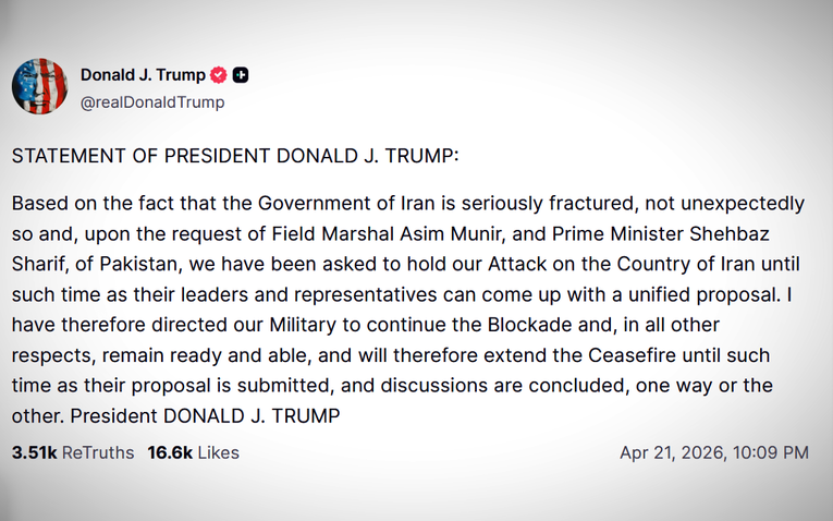 “Na temelju činjenice da je iranska vlada ozbiljno podijeljena, što i nije neočekivano, te na zahtjev feldmaršala Asima Munira i premijera Pakistana Shehbaza Sharifa, zamoljeni smo da odgodimo napad na Iran dok njihovi čelnici i predstavnici ne izađu s jedinstvenim prijedlogom”, napisao je Trump na društvenoj mreži Truth Social.