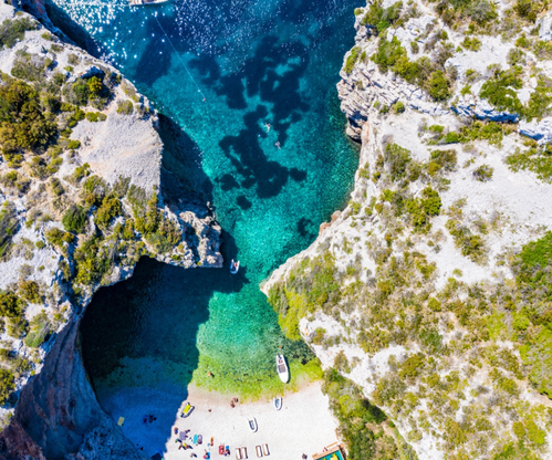 “Vožnja brodom iz Splita i šetnja južnom stranom Visa otkrit će vam Stinivu, bijelu šljunčanu plažu okruženu vapnenačkim zidinama. Pet metara široka ‘vrata’ otvaraju plažu prema tirkiznom moru.
