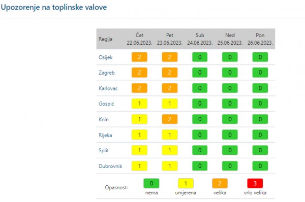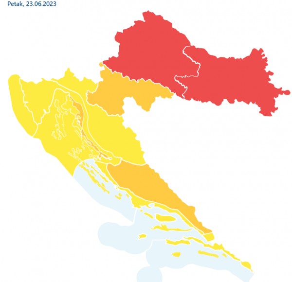 Žuti alarm zbog visokih temperatura upaljen je pak u zagrebačkoj, gospićkoj, riječkoj, splitskoj i dubrovačkoj regiji, gdje se očekuju temperature veće od 33 stupnja.