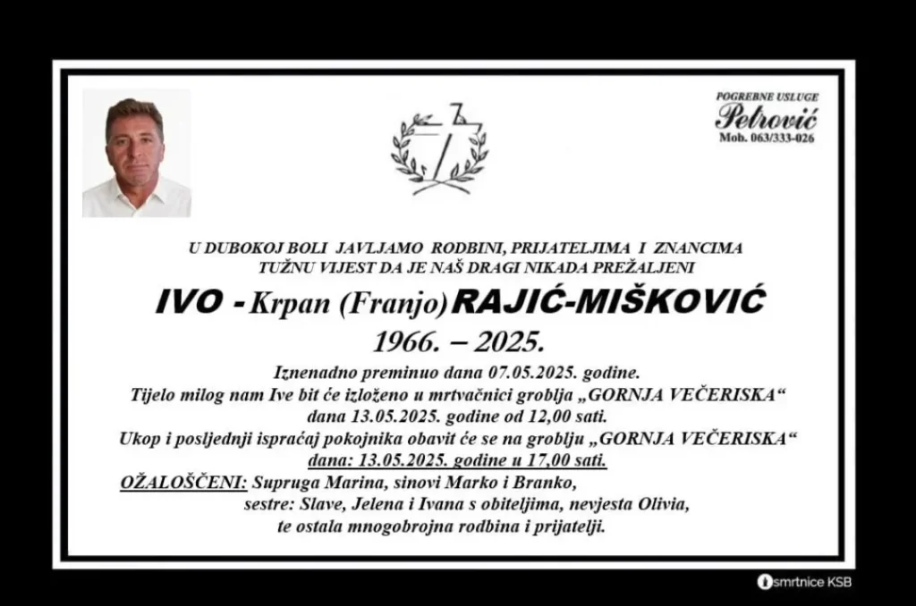 Ukop Vitežanina Ive – Krpana Rajić-Mišković (1966.) koji je iznenada preminuo u inozemstvu dana 7.5.2025. godine, obavit će se sutra 13.5.2025. godine na groblju Gornja Večeriska.