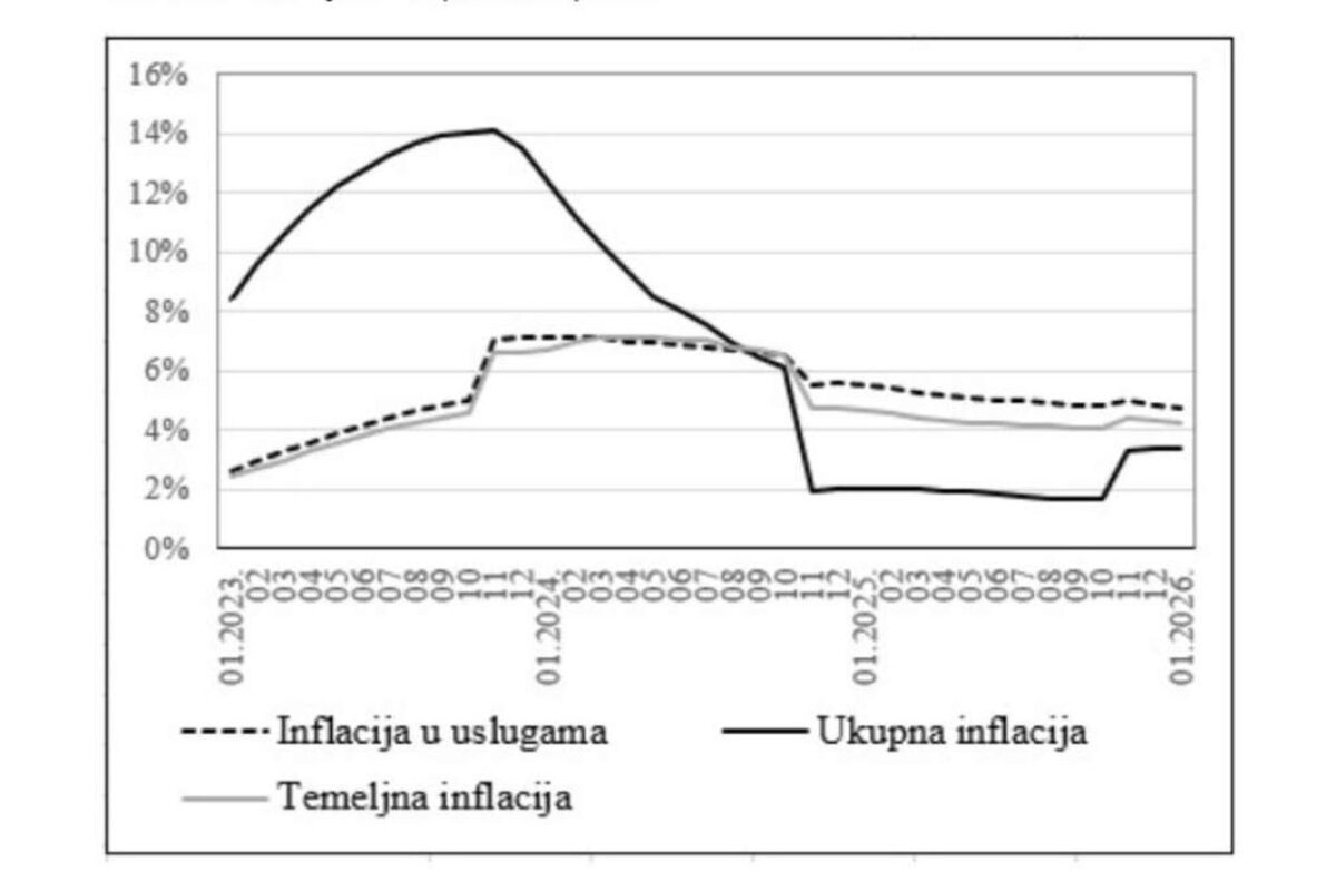 Centralna banka Bosne i Hercegovine procijenila je godišnju temeljnu inflaciju za siječanj 2026. godine na 4,17 posto, dok je godišnji rast prosječnih potrošačkih cijena u sektoru usluga procijenjen na 4,90 posto. Kako navode iz Centralne banke BiH, procjena temeljne inflacije na temelju službenih statističkih podataka viša je za 63 bazna poena u odnosu na procjenu iz prosinačkog kruga brzih procjena. Razlog tome najvećim je dijelom promjena pondera za pododjeljke koji ulaze u izračun temeljne inflacije.
