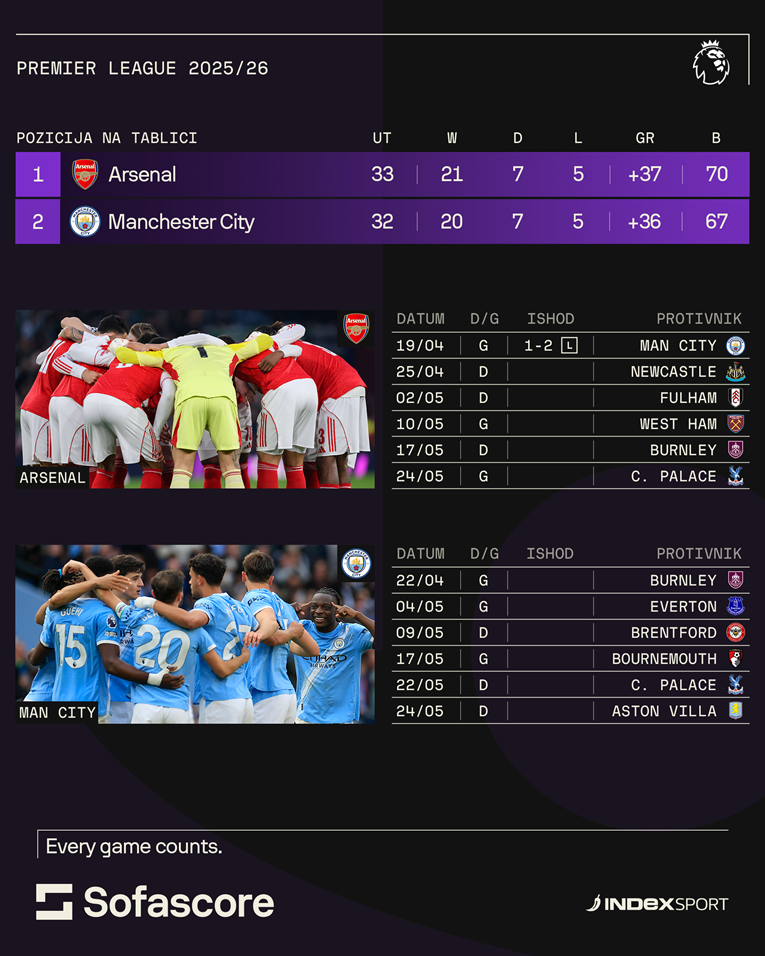 Ako gledamo poziciju protivnika, Arsenal ima lakši raspored do kraja u prvenstvu. Mikel Arteta ne mora se sve do kraja spremati ni za jednog protivnika iz gornjeg dijela ljestvice. Pep Guardiola ima ih tri, kako sad stvari stoje. City će do kraja igrati s trenutno sedmim Brentfordom, osmim Bournemouthom i četvrtom Aston Villom.