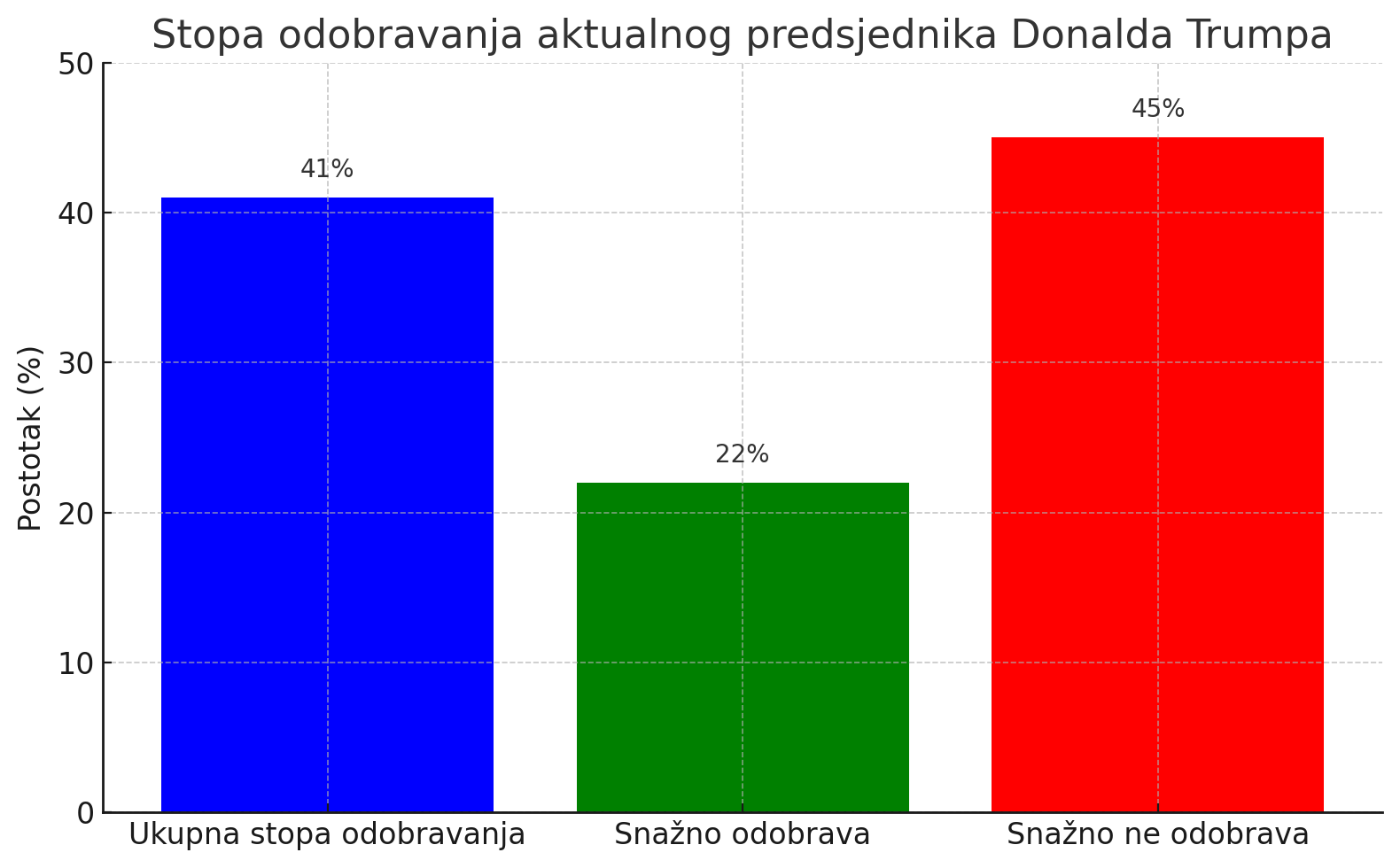 Manje od polovice (43%) smatra da su njegove akcije nužan “potres” u Washingtonu, dok većina (57%) misli da njegov pristup predsjedništvu nepotrebno izlaže državu riziku.