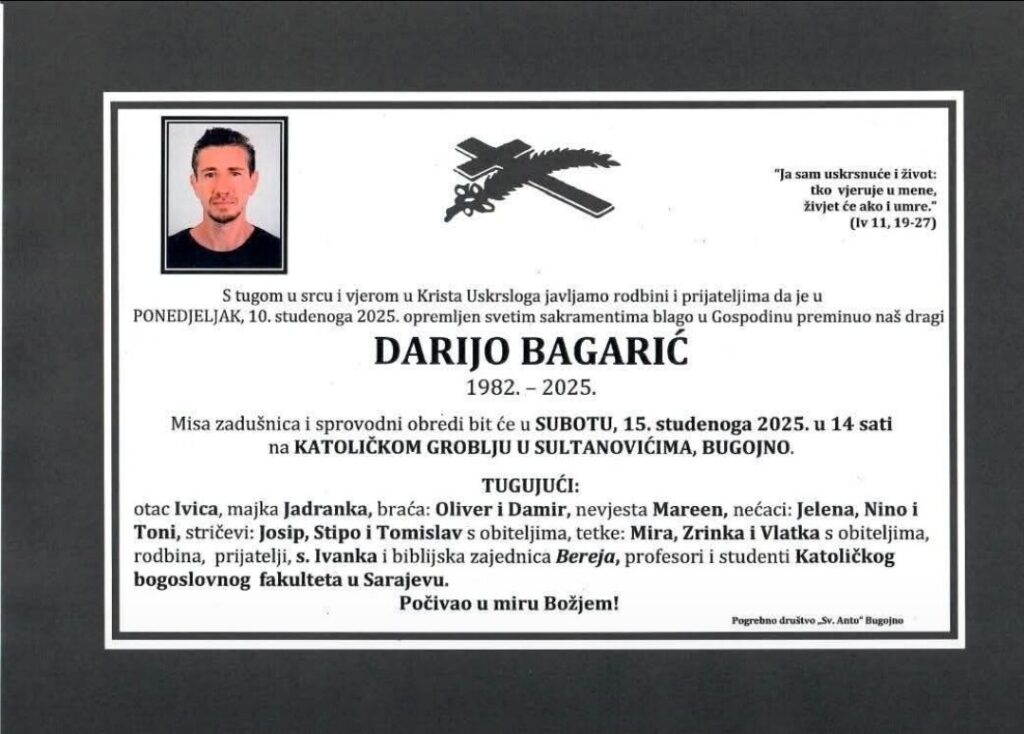 Misa zadušnica i sprovodni obredi bit će u SUBOTU, 15. studenoga 2025. u 14 sati na KATOLIČKOM GROBLJU u SULTANOVIĆIMA, BUGOJNO.