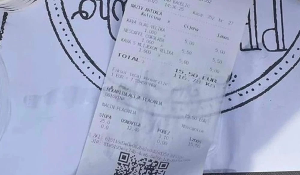 Jedna djevojka iz Šibenika ostala je šokirana i poslala račun za tri kave. To su platili 15, 50 eura ili 117 kuna, javlja SlobodnaDalmacija.